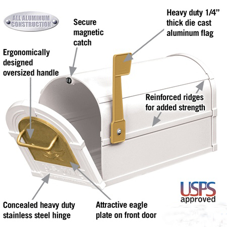 ![]() Eagle Mailbox White with Gold | ![]() Eagle Mailbox White with Silver |