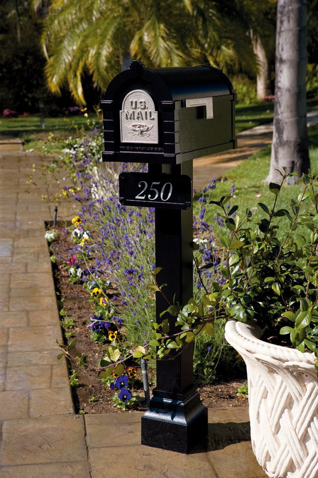 Basic price includes the Keystone mailbox and standard post. Optional items may be purchased as described. Address plaques can accomodate up to 5 numbers, vinyl address can be up to 20 characters including spaces. Bronze numbering is not visible on black or bronze mailboxes, you must select gold or silver. Dimensions: Mailbox - 12 1/4"H x 10 3/8"W x 20 1/8"D, Standard Post - 54"H x 4"W x 4"D.