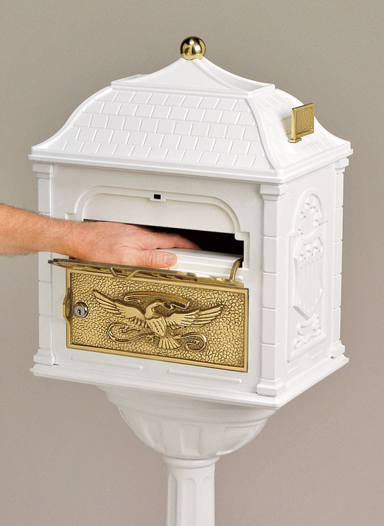 Gaines Classic Victorian mailboxes include a "standard" mail slot of 3" high x 10" wide. While the large size will not prevent unwanted hands from entering the mailbox, it does provide for large bundles of mail and small packages to be easily inserted into the mailbox. For those only moderately concerned with mail theft, this option may provide the best option as the presence of the lock typically provides some level of deterrence while not limiting the functionality of the mailbox. If security is a concern, the high security option restricts the opening by half, to 1-1/2" high x 10" wide. This option is factory installed and must be ordered at time of purchase, however, it can be removed by the user if you decide you'd prefer the larger mail slot. The image shown here is with the security option installed. You can see that the security plate covers the top half of the opening.